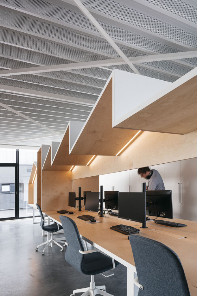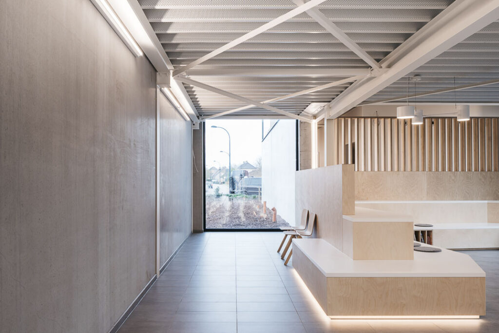 Voor het meubilair in de keuken, de bureau's en de tandartspraktijk werd qua materiaal gekozen voor een multiplex in Finse berk in combinatie met witte laminaat.